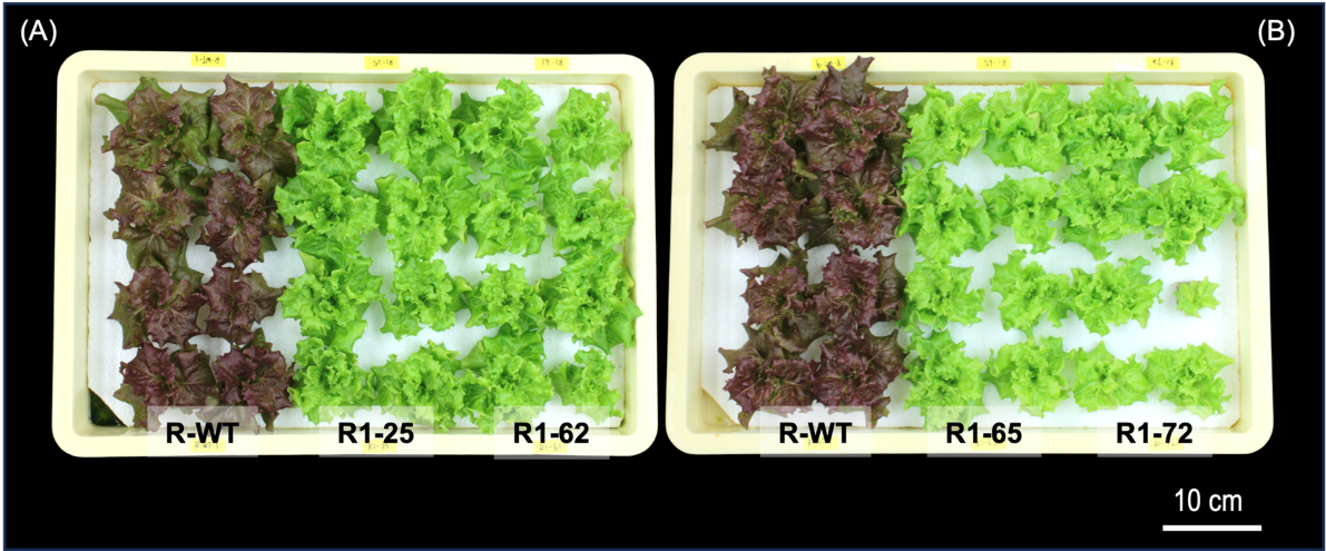 赤系レタスの赤色はアントシアニンによるものです。本研究では、アントシアニン合成関連酵素遺伝子をゲノム編集で機能喪失させ、生育への顕著な悪影響なく赤色が消失することを明らかにしました。またそれに伴って、ケルセチン類を含む他のフラボノイド群が増加することが分かりました。